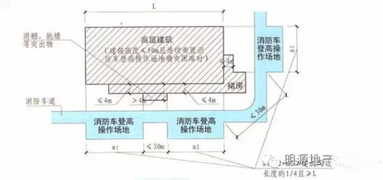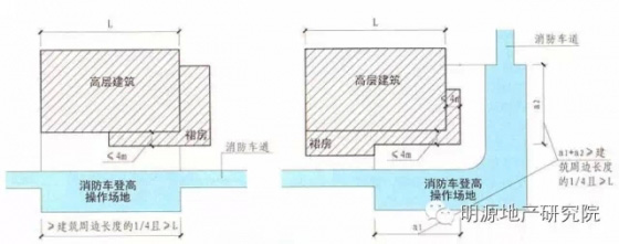 1)高層建筑應(yīng)至少沿一個(gè)長邊或周邊長度的l/4且不小于一個(gè)長邊長度的底邊連續(xù)布置消防車登高操作場地,該范圍內(nèi)的裙房進(jìn)深不應(yīng)大于4米;