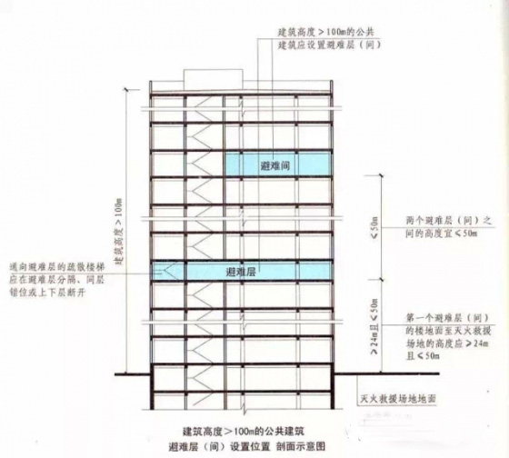 2.完善了公共建筑避難層的防火要求,如,第一個(gè)避難層(間)的樓地面至滅火救援場地地面的高度不應(yīng)大于50米,兩個(gè)避難層(間)之間的高度不宜大于50米;