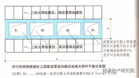 6.步行街兩側(cè)的商鋪在上部各層需設(shè)置回廊和連接天橋時(shí),應(yīng)保證步行街上部各層樓板的開口面積不應(yīng)小于步行街地面面積的37%,且開口宜均勻布置;
